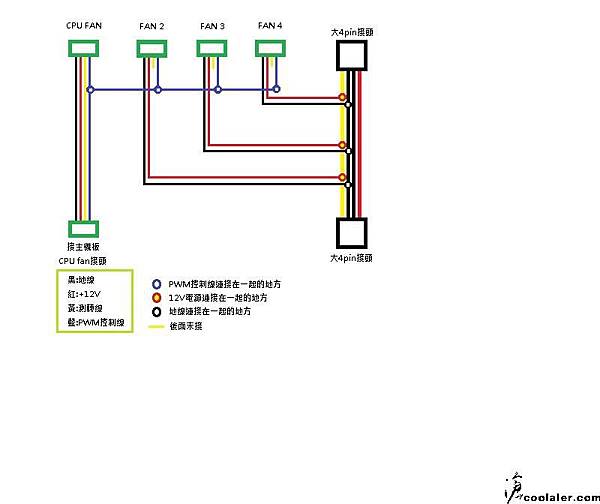 依照主機板廠商建議一個4pin風扇腳座最好不要接超過5個風扇,接法如下: