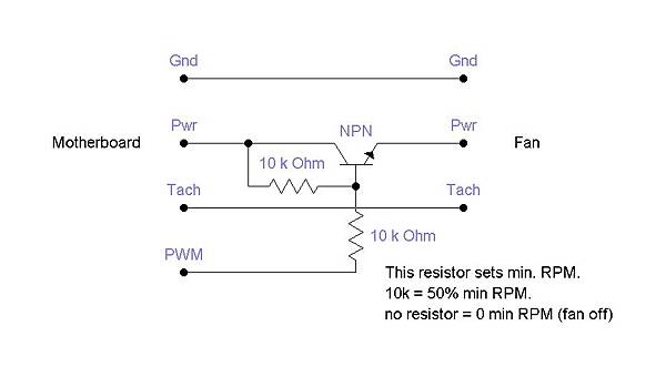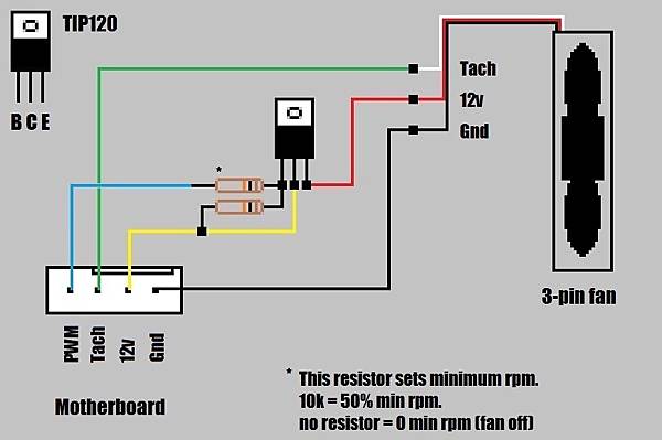 這是簡易的風扇減速控制,10K電阻即可讓風扇以50%的速度運轉,電阻拿掉則停轉。