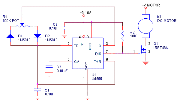 也可以透過簡易的555晶片製作PWM控制器,以下為範例電路圖: