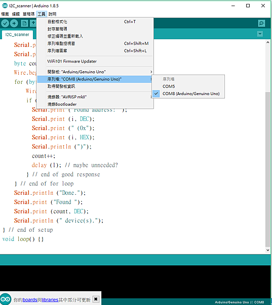 所以在Arduino上有人寫了一個 I2C scanner程式,可以讓你執行後