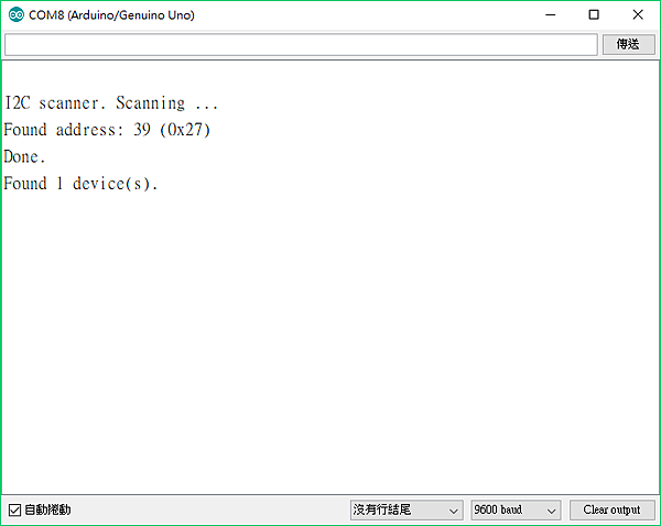 這裡就顯示了掃描的結果,所以I2C模組本身預設的位址就是0x27,